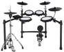 Complete digital drum outfit with dual-layer mesh drum pads mounted to an adjustable rack stand. Snare and floor tom pads are both 10" and are accompanied by a pair of 8" tom pads. Each pad has dual triggers for side-stick and rim-shot effects. Hi-hat, crash and ride pads each have edge and bow-shot zones and can respond to hand chokes for realistic muting. The hi-hat is mounted to a real stand with pedal trigger for a more natural playing experience. A pressure-sensitive remote pedal performs gradual closing of the hi-hats. A separate kick pad and pedal assembly provide a natural feeling bass drum trigger. All triggers are wired back to the main sound module, which has a large accessible control surface and backlit display. A total of 18 presets are included with master EQ & compression, individual overdrive and reverb effects. Proprietary Varitone™ system detects subtle changes in striking position to trigger responsive samples for the ultimate in realism. Output to a mixing console or drum amplifier can be either mono or stereo via 6.3mm jack and a separate 3.5mm TRRS jack is provided for headphone monitoring or 2-way connection to a smart-phone for live streaming. A built-in drum coach function is useful for improving technique from novice to professional standard. DM-310H is also supplied with the NBT-1 Bluetooth adaptor for wireless pairing with a smart phone for backing tracks to play along with. An inbuilt record function is also added to check back on your own playing. For morein-depth studio recording work, the rear panel USB port connects to a PC or Mac computer for both MIDI and audio streaming, enabling control and external sound source to integrate with a DAW recording suite. Far beyond the humble beginnings of electronic percussion, the DM-310H offers a natural feeling and playable kit with a full toolkit of features for drummers of any level and genre.