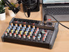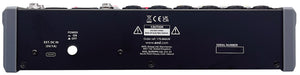Compact format audio mixer with 2, 4 or 6 mono input channels, a stereo line input and a further minijack stereo input. Each mono mic/line channel has a combo XLR/jack input with +48V phantom power switchable in pairs for the XLR inputs. Each mic/line channel has a Gain control for matching the input source and a low-cut switch to filter out rumble or handling noise from microphones. Each mono channel also has High/Low EQ controls and an FX level control. Pairs of mono channels can be linked to act as a stereo left + right pair as required. The onboard foot-switchable DSP effects engine has 99 presets for delay, reverb and modulation effects, each of which can be adjusted using two parameter controls. An onboard Bluetooth receiver has an illuminated pairing button and independent volume control. The USB type-A port on the top panel is for playback of audio files or can be used to record the main outputs to a USB storage device or as an external audio device when connected to a laptop. Output is delivered to a pair of balanced XLR connectors to provide low noise operation for high quality studio or live performances.