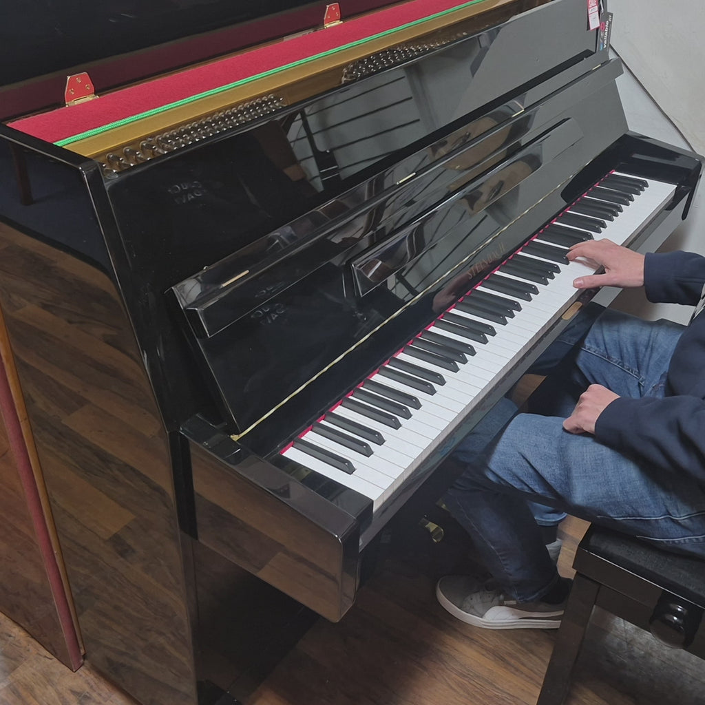 A compact, full-size upright piano in a beautiful shiny black finish, ideal for home practice and developing players. Standing at 108cm tall, the Steinbach 108 delivers a balanced, warm tone with a responsive action, making it well-suited to beginners through intermediate pianists.