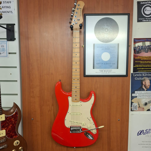 Rocket MusicSecond hand Rocket Music electric guitar finished in a striking red with a classic Stratocaster body design. Features dual-tone controls and a sing...